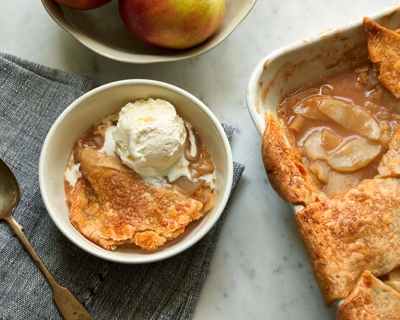 I serve apple pan dowdy as I would an apple crisp, spooning it into bowls and topping it with scoops of vanilla ice cream. The ice cream begins to melt just as the crust softens in the juicy, spiced apple filling… pure apple pie heaven.