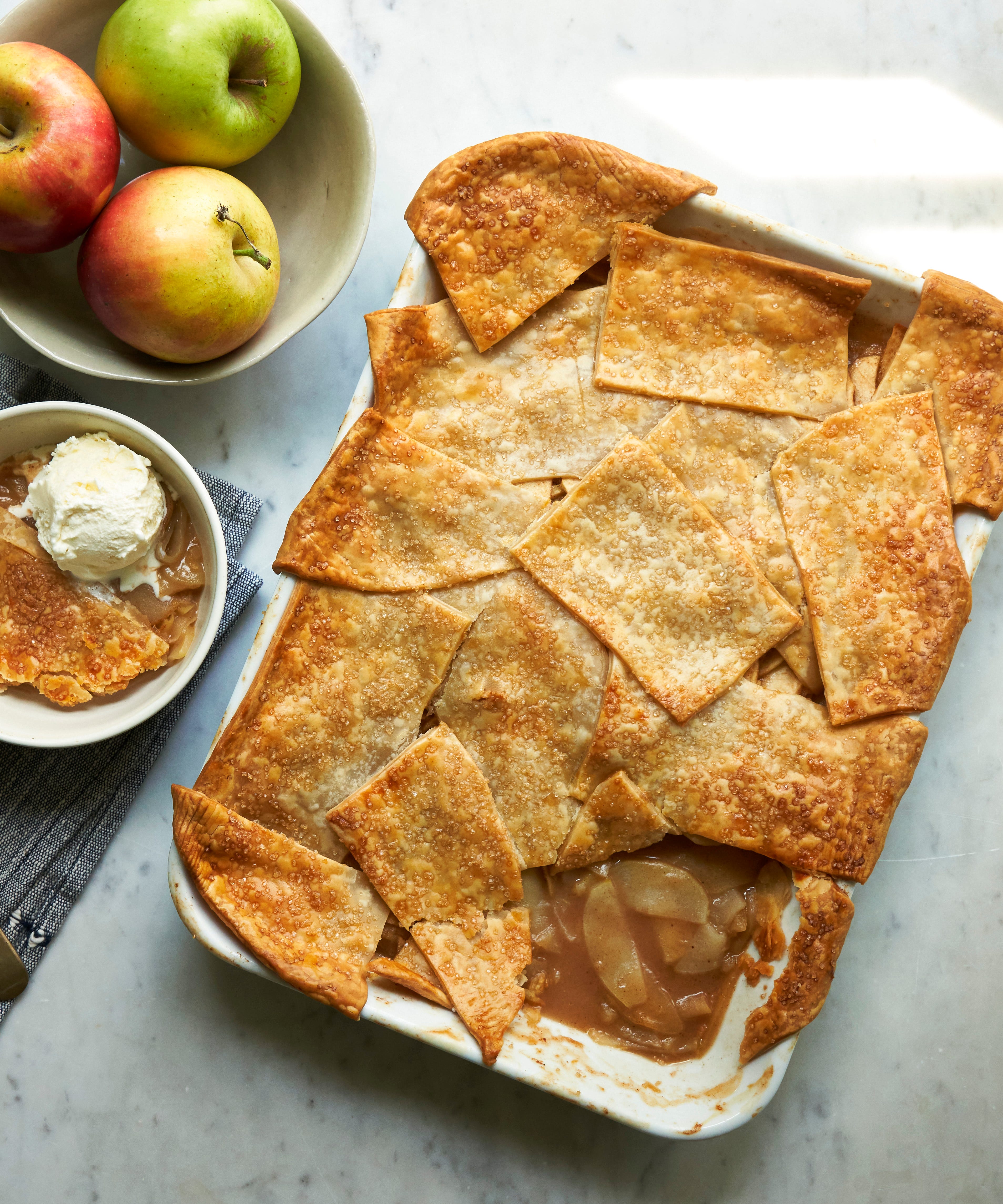 Rather than topping apples with one large sheet of pie dough, I decided to cut the pie dough into irregularly sized pieces before arranging them over the filling, forming a patchwork like effect with lots of crispy, buttery edges. The result is a dessert that feels slightly less “dowdy”-looking, (what a word!) though you can still mash up the crust to your heart’s desire when eating.