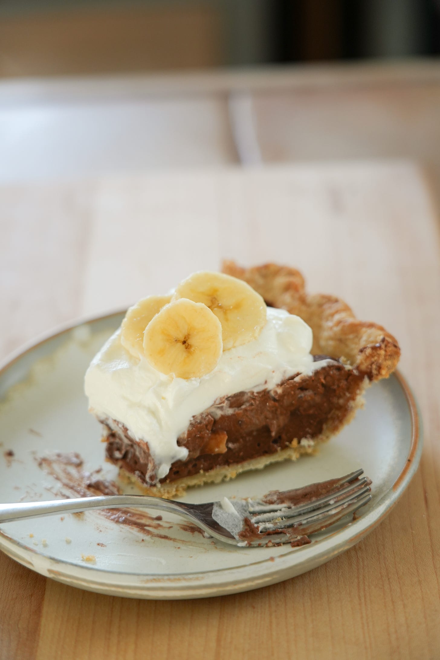 It starts with a flaky, all-butter pie crust, followed by layers of silky chocolate pudding and sliced bananas. Then it gets topped with a mountain of homemade whipped cream and some more bananas for good measure. Together, the crust, with its hint of salt, the rich chocolate pudding, fresh bananas, and a dollop of cream are, as my mom says in the episode, ‘the perfect combination.’