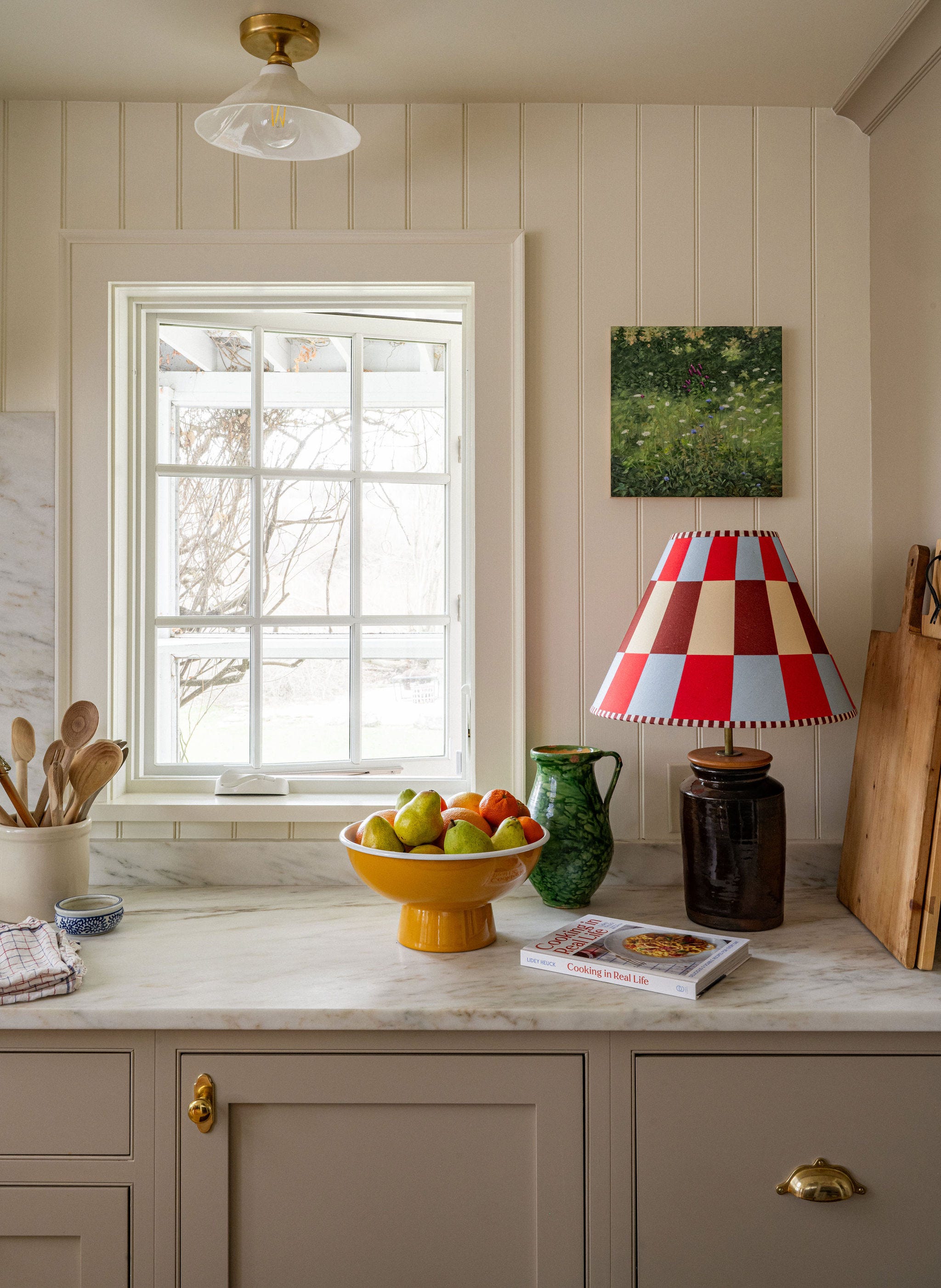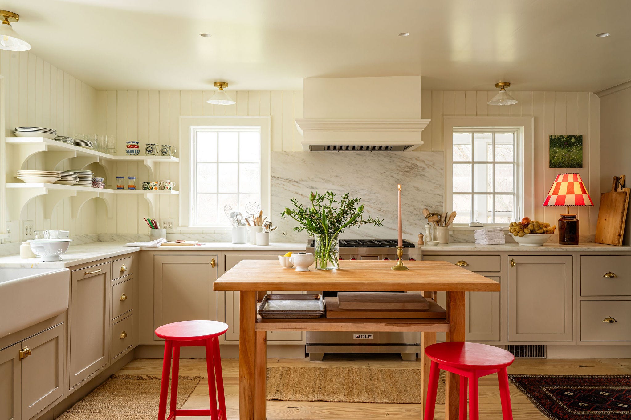 The cabinets are a simple shaker design, and I dressed them up a little bit with un-lacquered brass hardware. It looks shiny now but will age and develop a patina over time. For the countertops, I choose Danby marble, which comes from Vermont. I liked that the earthy, brown-ish veining gave it an already lived-in feel, especially on the stone backsplash. A brighter white marble might feel imposing there, but the Danby is subtle and doesn’t overpower the rest of the room.